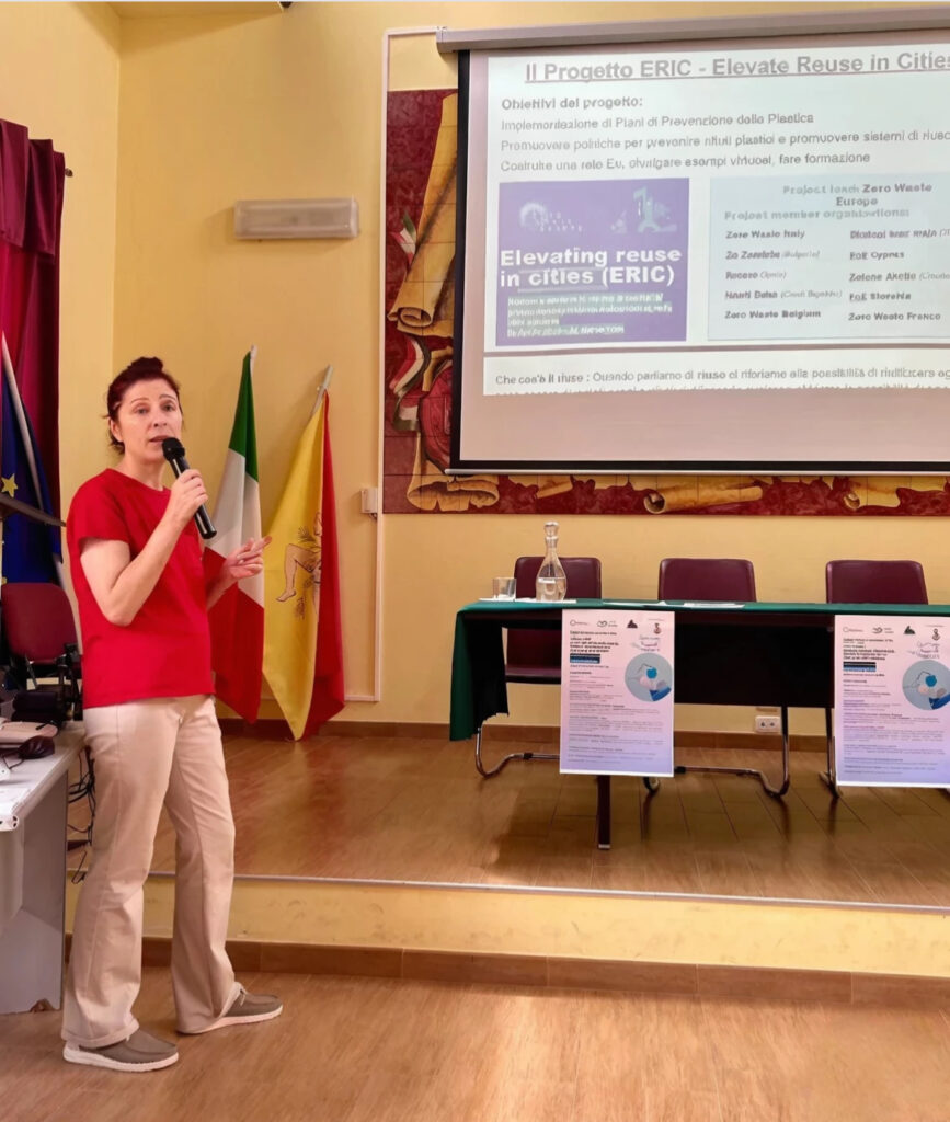 A seguire l’intervento di Laura Lo Presti, responsabile dei Comuni Rifiuti Zero per Zero Waste Italy, che ha illustrato gli obiettivi del progetto ERIC (Elevate Reuse in Cities) che vanno dall’implementazione di Piani di Prevenzione della Plastica alla promozione di politiche per prevenire rifiuti plastici e promuovere sistemi di riuso. Sono state mostrate alternative possibili all’utilizzo della plastica monouso come contenitori riutilizzabili per il cibo di asporto e azioni che i comuni possono applicare come la stoviglioteca con stoviglie riutilizzabili, per evitare i prodotti monouso nelle sagre, le ordinanze comunali per il divieto nelle feste del rilascio di palloncini in plastica, coriandoli in plastica, lanterne cinesi e altri dispositivi aerostatici, l’installazione di erogatori di acqua negli uffici comunali, la distribuzione di borracce agli studenti per evitare l’uso di bottigliette di plastica, ecc.