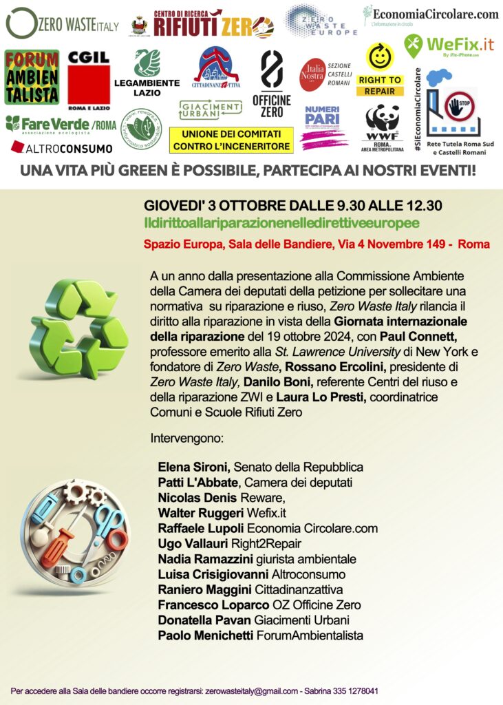 A un anno dalla presentazione alla Commissione Ambiente della Camera dei deputati della petizione per sollecitare una normativa specifica su riparazione e riuso, Zero Waste Italy rilancia il diritto alla riparazione in vista della Giornata internazionale della riparazione del 19 ottobre 2024, conPaul Connett, Rossano Ercolini, Danilo Boni e Laura Lo Presti.