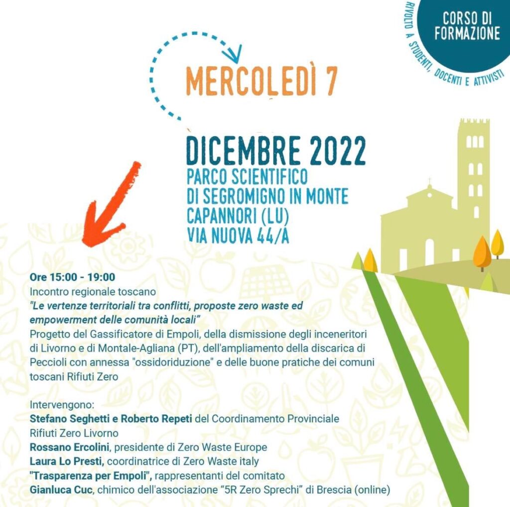 Particolare attesa, nell’ambito del quarto modulo formativo del 7 e 8 dicembre dell’Accademia Rifiuti Zero Mediterraneo presso il Parco Scientifico di Capannori, mercoledì 7 dicembre a partire dalle ore 15, per l’incontro che vedrà convergere da tutta la Toscana cittadini attivi impegnati nelle battaglie civiche contro inceneritori e discariche e nel promuovere Rifiuti Zero.