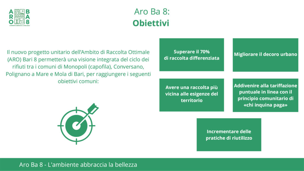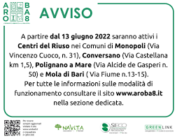 Dal 13 Giugno 2022 sono attivi quattro nuovi Centri del Riuso nei comuni dell’ARO/Ba8* di Mola di Bari, Conversano, Monopoli e Polignano a Mare (*Ambito di Raccolta Ottimale, unica organizzazione per la gestione unitaria del servizio di raccolta e trasporto dei rifiuti solidi urbani). I locali utilizzati e l’organizzazione è affidata al gestore dei rifiuti.
