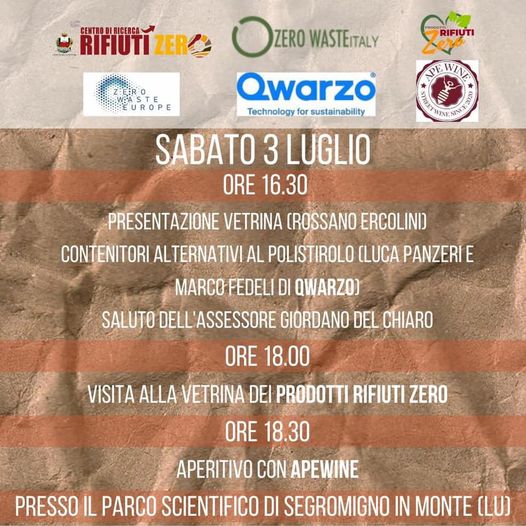 3 luglio • Segromigno in Monte (LU), Giornata Europea contro la plastica monouso. Ore 16:30 Presentazione della Vetrina dei Prodotti Rifiuti Zero. Ore 18:30 aperitivo (senza plastica) in collaborazione con ApeWine. Iniziativa all’aperto presso il Centro di Ricerca Rifiuti Zero nel Parco Scientifico. Ingresso libero.