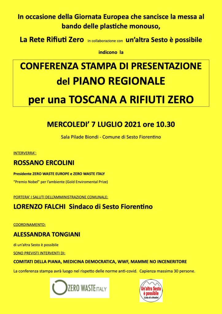 7 luglio • Sesto Fiorentino (FI), In occasione della Giornata Europea contro la plastica monouso presso la Sala Pilade Biondi del Comune ore 10:30 conferenza stampa di presentazione del piano regionale per una Toscana a Rifiuti Zero.